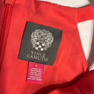 This striking red sheath dress by Vince Camuto features a dramatic asymmetrical ruffle cascading down one side, complemented by a chic halter neckline and a stylish side slit. Perfect for cocktail parties or a night out, its sleeveless design and structured fabric ensure a sophisticated and contemporary look.