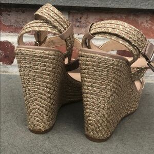 New. Never worn. Does not have tag. Platform heel natural with gold treading. Easy to pair with any outfit. Nude leather trim. Gold hardware.