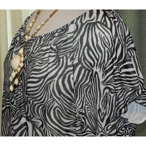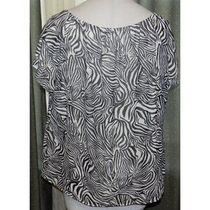 The Vince Camuto size 2X zebra print pull over top is a stylish and comfortable option for plus size women. This top features a black and white animal print pattern, short sleeves, and a relaxed fit. Made of polyester, it is machine washable and perfect for casual occasions. The round neckline with an elastic closure adds a trendy touch to this basic blouse, making it a versatile piece for the summer, fall, and spring seasons. Versatile style, perfect for jeans, slacks or your favorite skirt.
