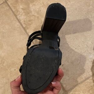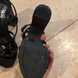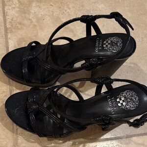 Super cute black patent strappy heels/sandals by my fav shoe guru Vince Camuto. Sandals have been worn and I have shown usage and wear. Disclaimer these sandals are not new but in great used condition with a lot of love and usage left for a great price. Chunky heels super comfortable and stylish.