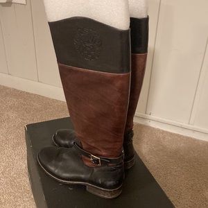 Vince Camuto tall boots womens size 8. Dark wood/black leather, gold buckle