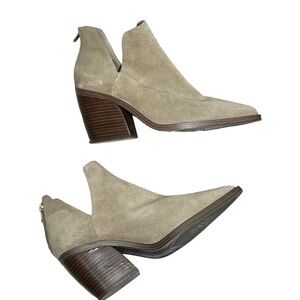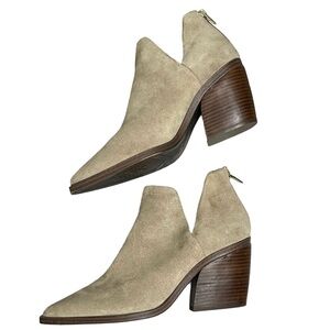 Dramatic angles define the Bibestie ankle boots from Vince Camuto. An extra-long toe ends in a square point, deep V-shape cutouts accent the sides, and a curved block heel supports the silhouette.