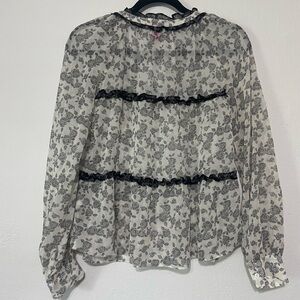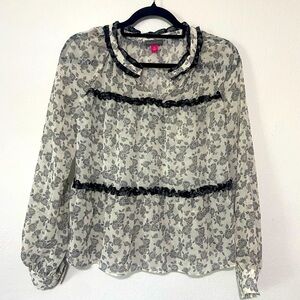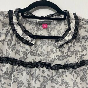 Vince Camuto women's XS black/white floral ruffle sheer notch neck blouse EUC