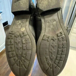 Excellent preowned condition. They have a stretch fabric back calf for comfort and a 1/4 side zip. Silver hardware and heel trim.