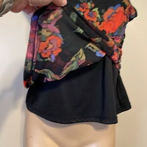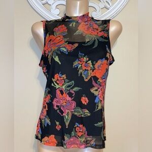 Vince Camuto womens blouse large 12 14 top mock Black Red Floral Sheer mesh cami