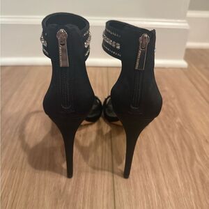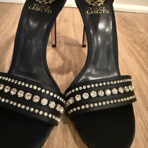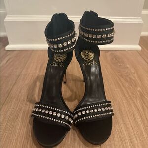 Step into elegance with Vince Camuto's black heels, featuring intricate embellishments and a sleek stiletto design. Perfect for formal occasions, these shoes combine sophistication with a touch of glamour.