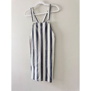 Vince Camuto XS Striped Indigo Blue and White Denim Overall Dress or 'Skirtall.' Features pockets and branded buttons, and racerback-like back. Womens Size XS but designed to be worn a little loose.