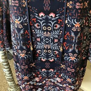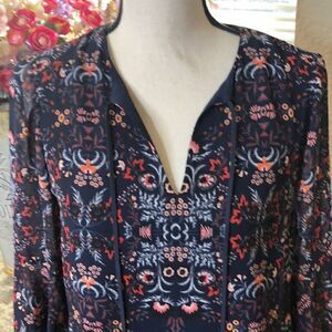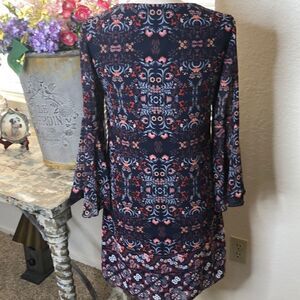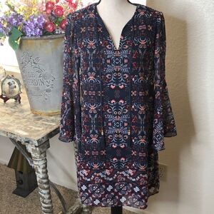 Gorgeous color and print on this beautiful dress from Vince Camuto. Easy style with an added punch of sheer bell sleeves, and ties with tassels. Perfect for work, dinner out, or a special event. Width at bust is 17.5” seam to seam laying flat. Waist 17”. Hip 19”. Length 33.5”.