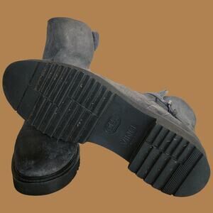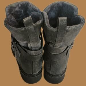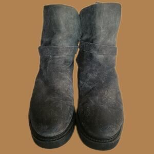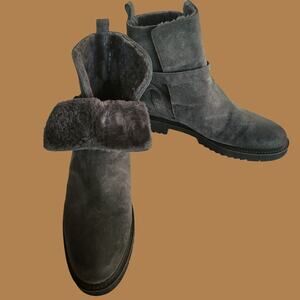Cozy grey suede pull-on suede bootie with plush shearling lining and adjustable buckled ankle strap from Vince Italy. The twice worn boots are a US 10 or a EU40. Shaft height: 6”. Heel height: 1.5”.