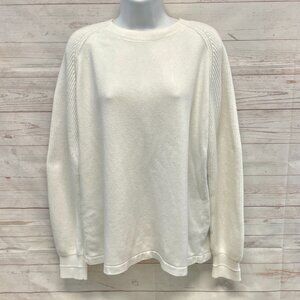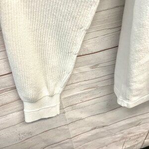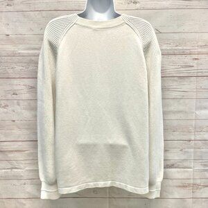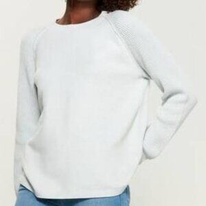 sleeves are ribbed knit look, and body is a tighter knit woven look.