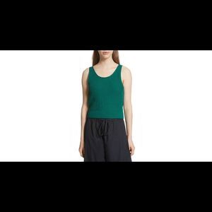 Vince Crossover V-Back Ribbed Tank in Malachite Green Color. Scoop neckline, V-back, sleeveless, thin straps.