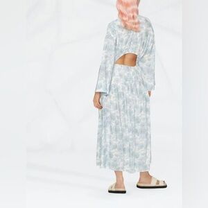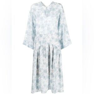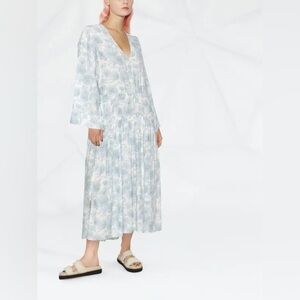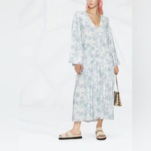 This Vince dress features a floral print, V-neck, long wide sleeves, cut-out detailing, drop waist, and ankle-length hem.