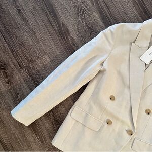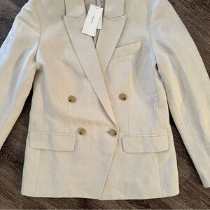 Vince's blazer is designed so it fits in nicely with this season's earthy palette. Made from breathable linen-blend twill spun with generous amounts of cotton, it has a double-breasted silhouette enhanced by lightly padded shoulders and peaked lapels. The smooth satin lining ensures it layers comfortably over almost anything.