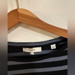 Women’s Vince drop shoulder long sleeve tee / top + size small + blue and black stripes + viscose / very soft material + dolman sleeve + more of a relaxed fit + no flaws / good, used condition with light wear + approx measurements, pit to pit: 20.5in & length: 25.5in + ships from 100% smoke free home + retails for $125