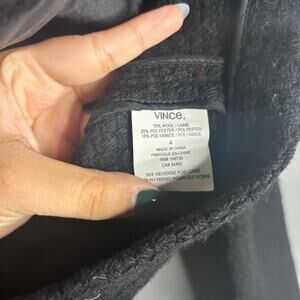 Vince Faux Leather Wool Blend Tweed Jacket in Black. Size 4. Features long sleeves, concealed front zipper closure, and faux leather patch pockets. Style VX001-90363. 70% Wool, 20% Polyester, 10% Polyamide. Excellent condition, no flaws.