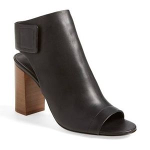 With its peep-toe design and chunky stacked wooden heel, this modern leather bootie exudes downtown cool. A wide, adjustable ankle strap perfects the fit while maintaining the streamlined silhouette.