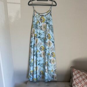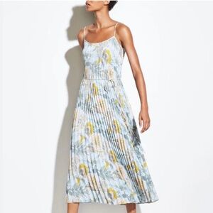 Elegant pleated midi dress by Vince. Features a floral pattern with blue and yellow hues. Spaghetti straps and flowing silhouette.