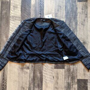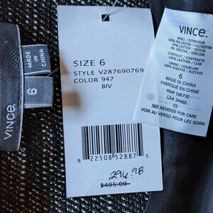 This is a Vince Boucle Jacket in a dark gray heathered black color. It is new with tags. It is a size 6, and the last three images show measurements. Full front zip closure, round neckline, fringe trim, lamb leather contrast, slim fit, warm soft polyester cotton viscose blend fabric.