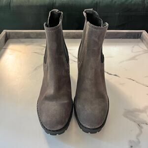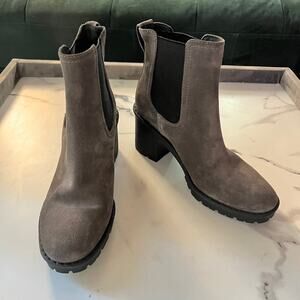 Vince 'Henderson' grayish brown suede water repellent chelsea booties. Lugged rubber sole with a chunky 3" block heel and 3/4" platform. Utilitarian and perfect for work to play in rainy weather. Leather sueded upper with a water repellent coating. 5" shaft with elastic insert for pull on design. In excellent condition. Size 6.