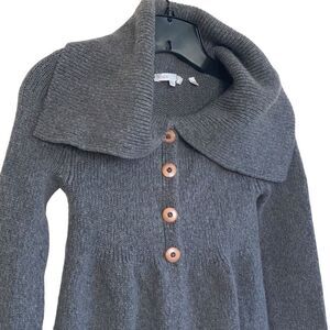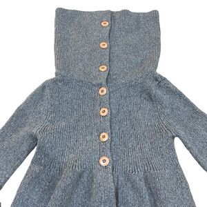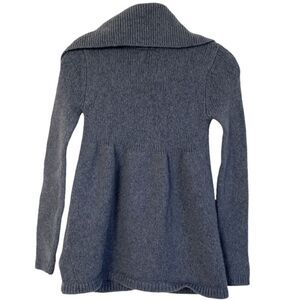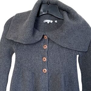 Beautiful grey wool blend cardigan sweater with high turtleneck collar that can be worn buttoned or unbuttoned. Buttons stop below bust creating an empire waist.