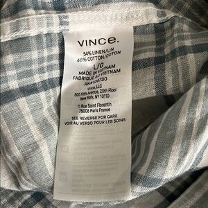 Casual plaid shirt by Vince. Features a classic button-down design. Soft fabric in a linen and cotton blend for all-day comfort. Quality piece by a sought out designer. Like new; no stains, holes or damage. An excellent addition to any closet!