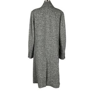Vince 'Herringbone' Grey Wool Double Breasted Coat Size M: button-front closure, fully lined, interior kerchief chest pocket, flap welt side pockets, three-button sleeves, felted undercollar, back vent, measurements: 20 inch bust width x 41 inch center back length x 24 inch sleeve length, light pilling on the underside of both sleeves and on both torso sides.