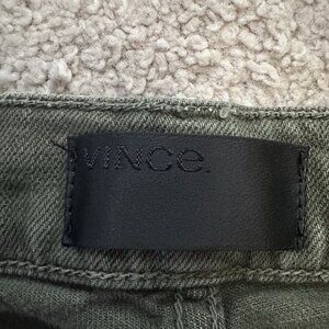 Vince green lightly distressed skinny jeans in women’s size 24. Jeans have light distressing on front and back. Slim fit. Some fading. Soft and thinner feel.