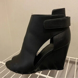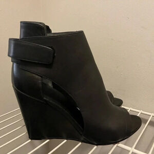 Size 9-9.5 regular width wedge leather booties in a regular width. Based on the width of the shoe it may best fit a size 9.