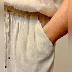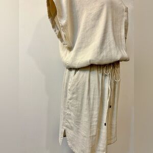 Vince Linen Blend casual midi dress. This is an easy, throw on and go dress. Short sleeves, round neck with an adjustable, drawstring waist. Single patch pocket on front left breast. Shirttail hemline adds to the relaxed feel. Natural creamy beige in color.