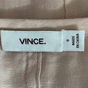 Vince Linen Blend Drop Waist Pleated Skirt Dress in Peach - Size 8. Great pre-owned condition. Small pink dot on the back mid-neckline, shown in pic. Looks to maybe be a pen mark. Any dry cleaner could get that out for you. Round neckline, split neck, 3 button covered placket, drop waist, pleated skirt, 3/4 length cuffed sleeves. Linen, viscose and elastane fabric composition. Approximate measurements: 20" pit to pit, 36" length. Above knee on me and I'm 5'5".