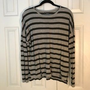 Vince long sleeve, boxy tee in light grey with olive green stripes. 100% viscose. Size M, 25" PtP, 25" long (slight hi lo hem). EUC, no pills or flaws.