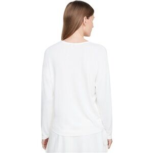 This top is so beautiful and soft. A great layering piece or it can be worn on its own. It is in excellent condition except for some slight discoloration on the inside of the the back collar. Cannot be seen while wearing. See last two pictures. Otherwise it is in excellent condition and in bright white. No other stains or major signs of wear. As seen by measurements it is meant to fit slightly oversized. Back is slightly longer than the front. A beautiful staple piece.