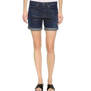 Achieve effortless, casual style with these relaxed boyfriend style denim shorts, designed for a laid-back yet polished look. Crafted from a premium blend of 98% cotton and 2% Lycra elastane, these shorts offer just the right amount of stretch for comfort and flexibility. Featuring five-pocket styling, a zip fly with button closure, a dark indigo wash with whiskering, light fading, and rolled cuffs, they add a touch of vintage-inspired charm to any outfit. The relaxed-boyfriend fit makes them perfect for pairing with your favorite tops and sneakers for an easy, everyday look. Very good pre-owned condition, no visible flaws.