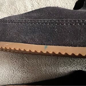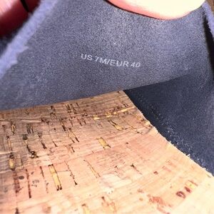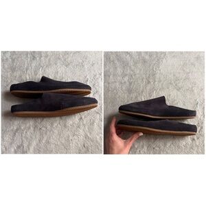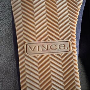 Good used condition. Men's Alonzo Suede Backless Loafer by Vince in Navy, a dark blue shade with cream detailing. Luxe contemporary minimalist aesthetic, a great staple shoe that can be dressed up or worn casually. Slip-on backless loafer flats with supple suede upper and rubber sport sole, see video. Note: light wear throughout with minor lifting to insole at one heel, faint fading/scuffing to upper, small surface mark at one side and light streetwear to bottom sole, see photos. Size 7, see photos for measurements.