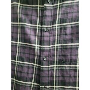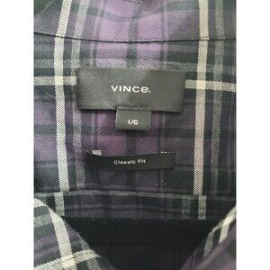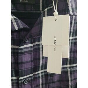 The Vince Men's Large Purple Black Plaid Cotton Long Sleeve Button-Up shirt is a classic and stylish addition to any man's wardrobe. Made from 100% cotton with a flannel fabric type, this shirt is machine washable and features a collared neckline, long sleeves, and a button closure. The shirt is suitable for various occasions including travel, weddings, parties, casual wear, workwear, and business meetings. It is a versatile piece that can be worn in all seasons and adds a touch of preppy and city-inspired style to one's outfit.