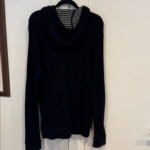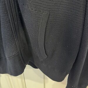 Navy waffle knit zip up hoodie with navy/gray stripes (interior) hood. Slight signs of wear but in overall great condition!