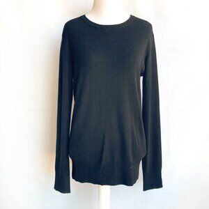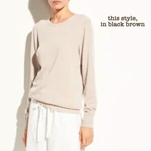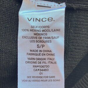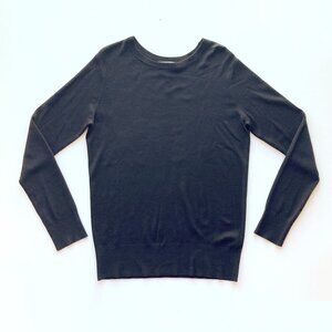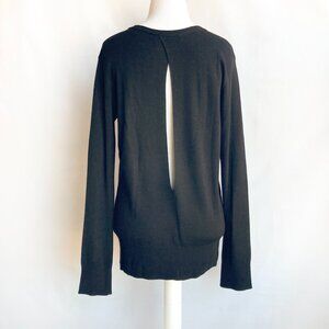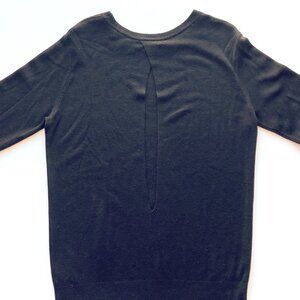 100% merino wool pullover sweater from Vince has an unassuming front, yet a sexy open back design. Very dark brown; looks black in low light. Roomy, slouchy fit.