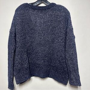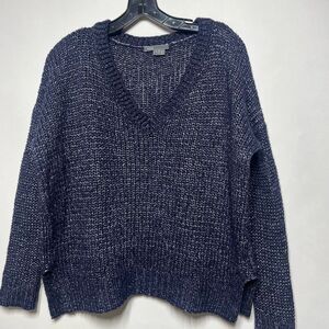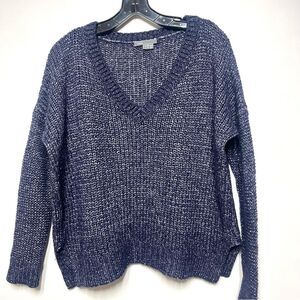 Features an oversized/slouchy fit, a v-neckline, pullover styling; no clasps or closures, ribbed knit texture on the neckline, sleeves and hemline, & side slit detail at the hem.