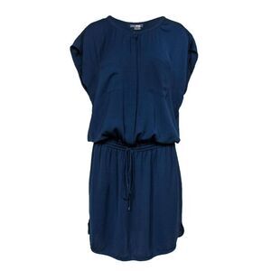 Sleeveless, Button Up Closure, Navy Blue, Elastic Wasit, Drawstring, Modern Theme, Collarless, Spring, Summer, Vince Mini Shirt Dress.