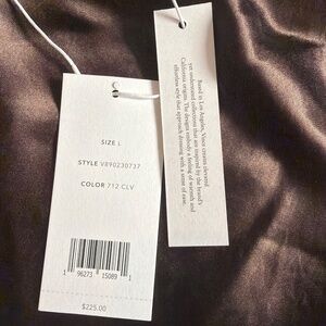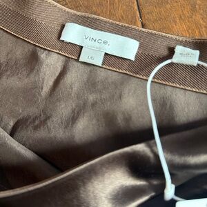 πHPπ Vince NWT short mini original satin brown bronze with gold/olive undertones slip skirt L Large. Elastic waist Flattering hang. According to the tag the color of this is called clove. Because the fabric looks SO different in different lighting I found the closest one for the model pic- and it could be the correct color! But more to show the fit