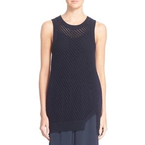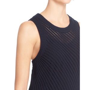 Brand new with tags, women's size Large. Retails for $225! There are so many ways to style this VINCE Navy Blue Diagonal Mesh Stitched Open Knit (Openwork) Cotton Tunic Tank Top! A diagonal mesh stitch lightens this longline tank knit from soft cotton and styled with a cool asymmetrical split hem at one hip. Crewneck. Love the slit in the hem! Made of 100% Cotton.