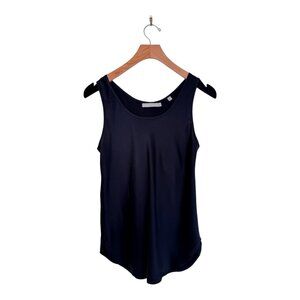For a quiet luxury basic look to this lustrous silk satin tank top from Vince. The fluid design comes in navy blue and has a semi flared silhouette with a classic scoop neck and back. A perfect pairing for holiday gatherings!