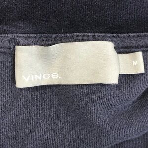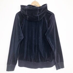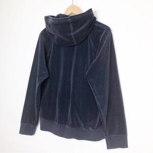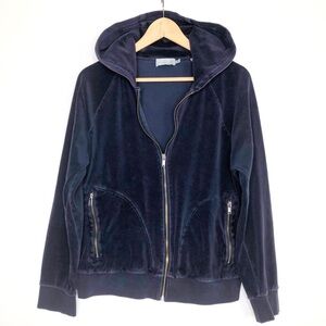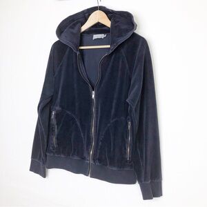 Vince Luxurious navy velour hoodie. Features a full zip front. Includes two front pockets. Perfect for casual wear.