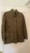 Olive green military-style jacket. Features multiple front pockets. Button closure and high collar.
