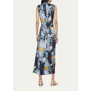 Featuring a V neckline, sleeveless design, and a wrap silhouette with tie-back straps. Adorned in a stunning painted bouquet print for a romantic, feminine look. Midi length with a concealed side closure for a seamless finish. Crafted from soft satin viscose for a fluid drape and luxurious feel. Material: 100% Viscose. Dry clean. Fits true to size