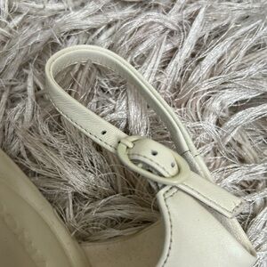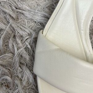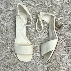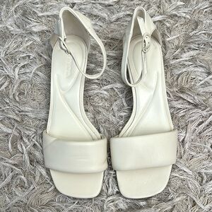 Vince Pepa Ankle Strap Kitten Heel Sandals in Marble Cream. Size 9, in excellent condition; these were a store display, therefore show few flaws: “dents” from handling on the top leather strap (left shoe); discolored mark near heel; some minor rubbing at the toe box; sticker residue on the sole. Retail $295, sold out everywhere in this size.