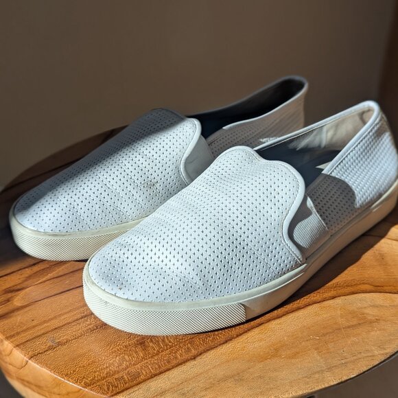 White leather sneaker. Used, some discoloration, a little dirty. Good condition.