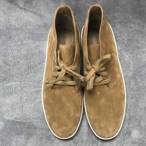 Experience the elegance of Vince's Camel High Top Sneakers, crafted with a soft suede upper and a sleek white rubber sole. The minimalist design features a two-eyelet lacing system and an ankle-high cut, perfect for elevating your casual and smart-casual ensembles.