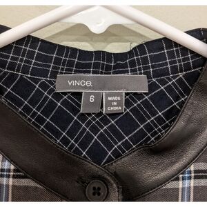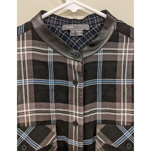 Vince Plaid Button Up Tunic with Leather Trim Mock Neck Collar Size 6