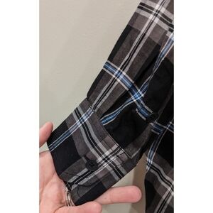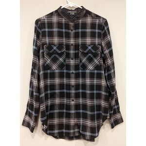 Excellent pre-owned condition. Vince blue plaid long sleeve button up tunic. Leather trim Mock Neck collar. Size 6